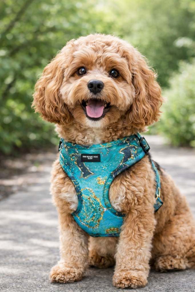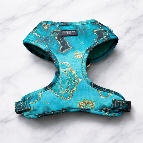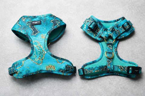 Finished with luxurious gold hardware for a touch of sophistication, this harness combines style and practicality. Crafted from fast-drying, custom-printed neoprene and lined with breathable mesh, it keeps your dog cool, comfortable, and ready for any adventure. With secure buckles, an easy-to-attach D-ring, and full adjustability, the Emerald City harness offers both beauty and peace of mind in every step.
