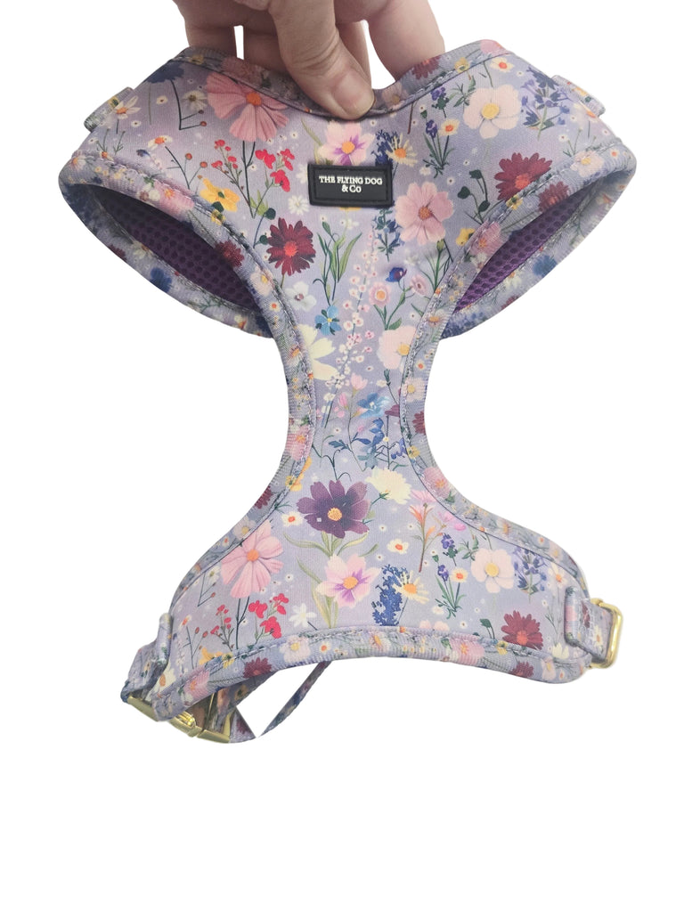 Finished with luxurious gold hardware for a touch of sophistication, this harness combines style and practicality. Crafted from fast-drying, custom-printed neoprene and lined with breathable mesh, it keeps your dog cool, comfortable, and ready for any adventure. With secure buckles, an easy-to-attach D-ring, and full adjustability, the Sweet Violet harness offers both beauty and peace of mind in every step.